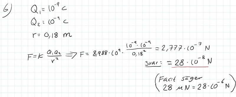 Hallå! Jag får fel i min lösning som ni ser i min bifogade printscreen, jag får 28*10-8 N, men i facit står 28*10-6 N. Någon som ser vad jag gör fel?