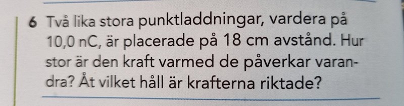 Hej igen, jag hittade det själv, hade gjort fel med potenserna för laddningarna :) 10-8 ska dom ju ligga på!