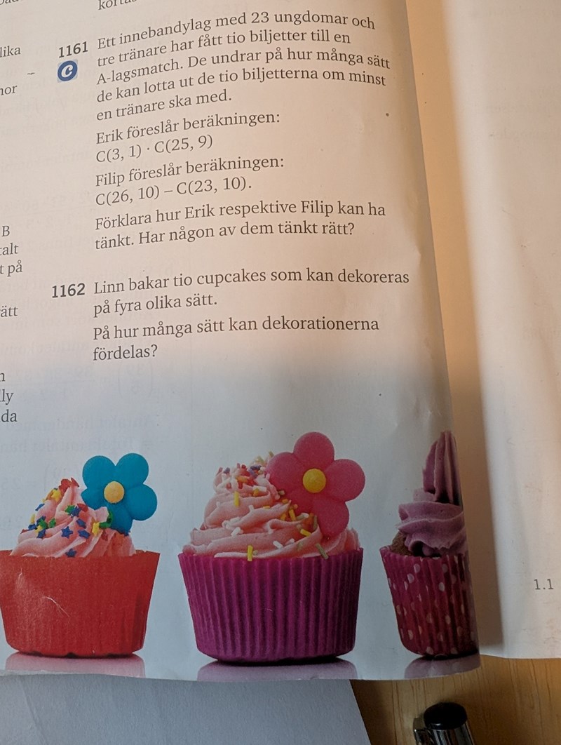 Sedan är det som vanligt att dubbletter måste divideras bort. Ordningen på de 3 pinnarna spelar ingen roll, och inte heller ordningen på kakorna. Till exempel vilka 4 av kakorna som har dekoreration chokladströssel på sig är oväsentligt. Endast en tänkbar kombination att 4 av några av kakorna har strössel på sig. Så, det dividerar vi bort.