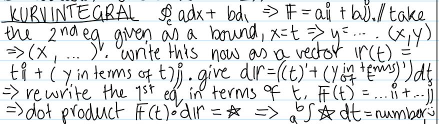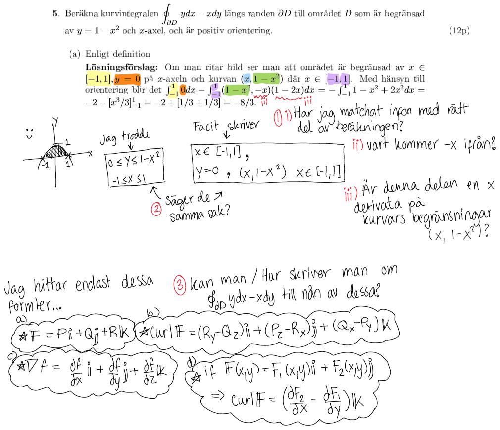 1) i) Du har matchat rätt, men det är ”,” som är missat i (1,-2x), Det är alltså derivatan till parametriseringen (x,1-x^2). Det är också xdy missat i den första (gul/röd) integralen, där dy=0, då y=0.