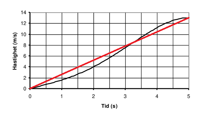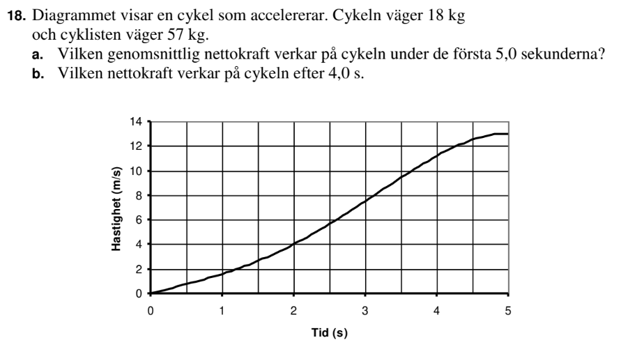 • a-uppgiften efterfrågas den genomsnittliga kraften under de första 5 sekunderna. Då ska du beräkna den genomsnittliga accelerationen (dvs medelaccelerationen) under den tidsperioden. Här gäller att medelaccelerationen a=vslut-vstarttslut-tstarta=\frac{v_{slut}-v_{start}}{t_{slut}-t_{start}}