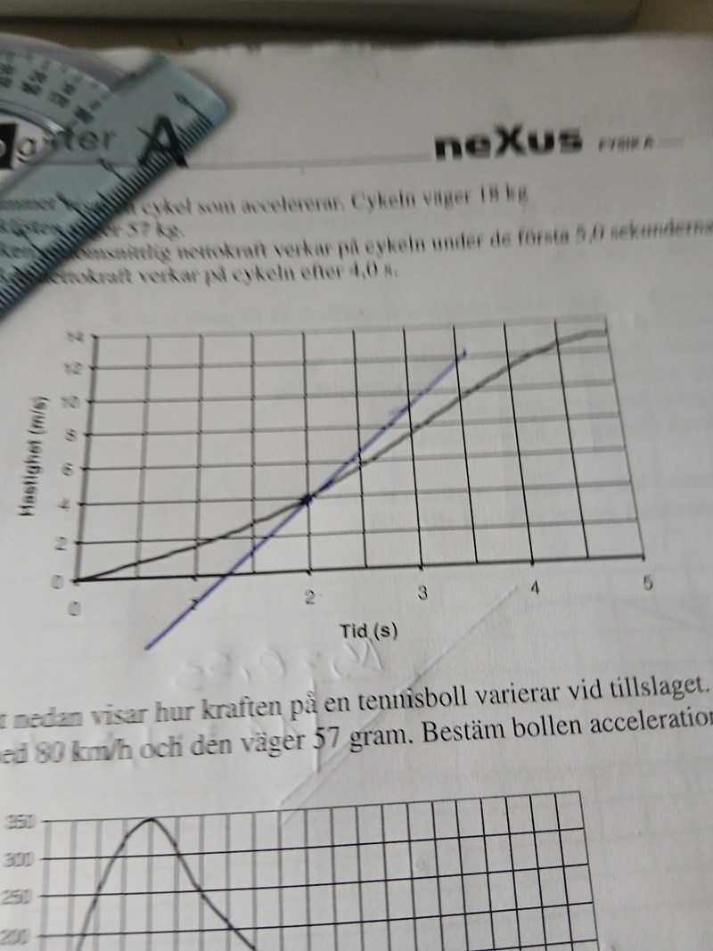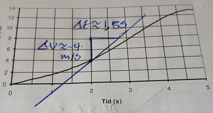 jag tänkte rita en tangent för sedan beräkna lutningen för att få fram accelerationen och med det kan jag använda Newtons 2:a lag F=ma.