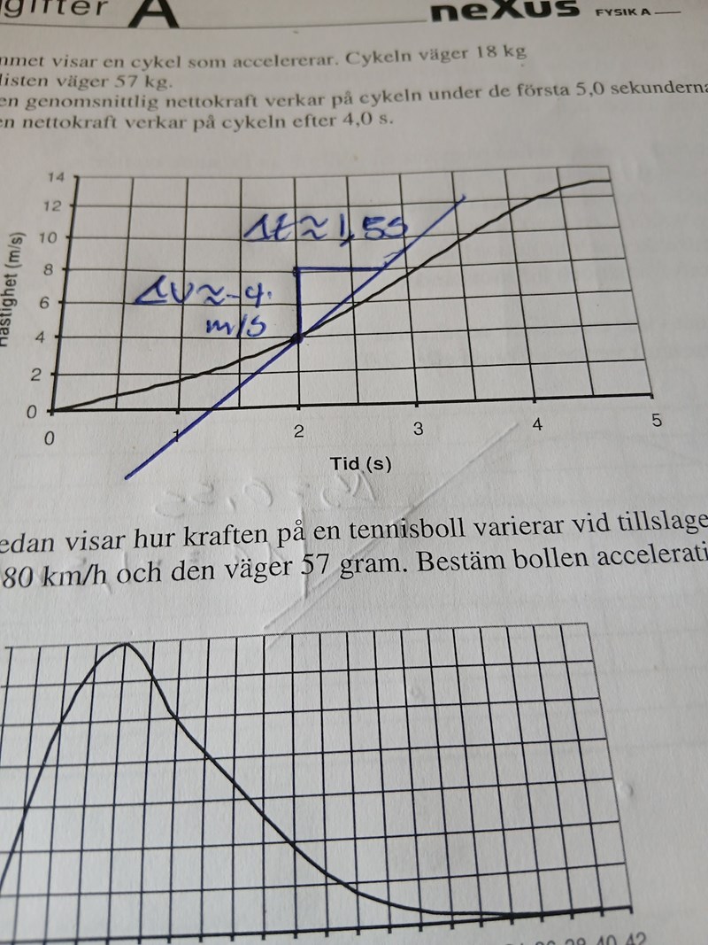 • b-uppgiften efterfrågas den nettokraft som påverkar cykeln vid t=4t=4 s  Då ska du beräkna momentanaccelerationen vid t=4t=4 s, vilket är lika med derivatan av vt-grafen vid t=4t=4 s. Här är det rätt tänkt att rita en tangent vid t=4t=4 s och bestämma dess lutning.