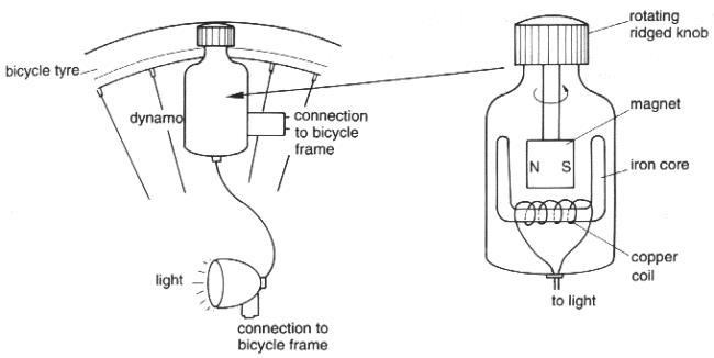 Magneten rör sig när cykel-hjulet roterar. Därför ändrar sig magnet-fälten i järnkärnan, som är orsaken till varför även elektronerna i spolen rör sig. Det är elektronernas rörelse som är elektricitet och som får lampan att lysa.