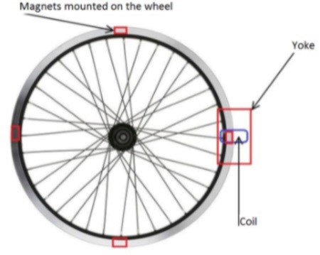 små permanentmagneter runt hela fälgen som löper genom ett ok där en spole är monterad. Se