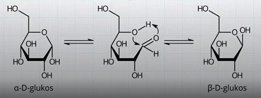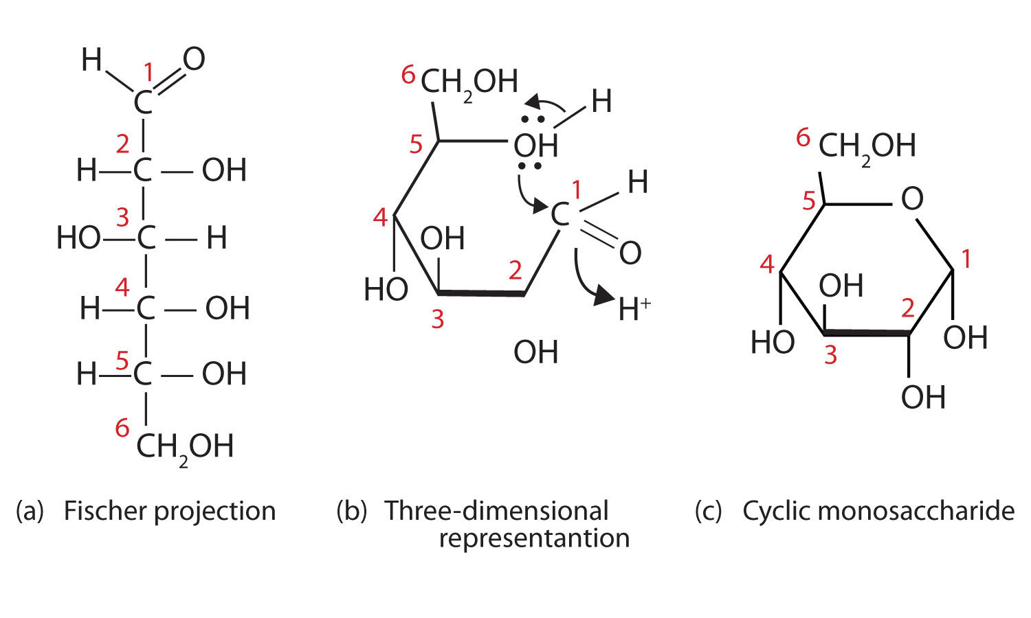 Som, Lobbe skrev, finns glukos i formen av en ring. Där en änden av molekylen binder till den andra änden och en cyklisk form fås, som i bilden nedan till höger. (I mitten illustreras hur hydroxigruppen på kol 6 anfaller karbonylkolet och på så vis skapar den sista bindningen, vilken gör molekylen cyklisk.