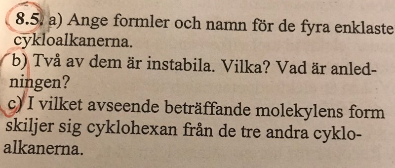 okej jag tror att jag hänger med nu, men på b) när två av dem är instabila är det då cyklopentan och cyklohexan för att de är mest böjda?