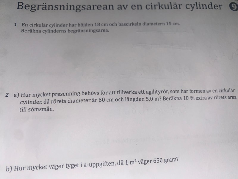 Ja då blir det tillsammans cirklens area är ju 30 cm X 30 cm X 3,14 sen X 2 det är ju två cirklar rektangelns diameter är 60 X 3,14 = 188,4 cm sen 500 cm X 188,4 cm det blir 99 852 cm2 men sen 10% till då tar jag 99 852cm2/10 = 9985,5 alltså är det 10% då blir det 99852+ 9985,2 = 10 085, 052cm 2 vilket inte facit säger