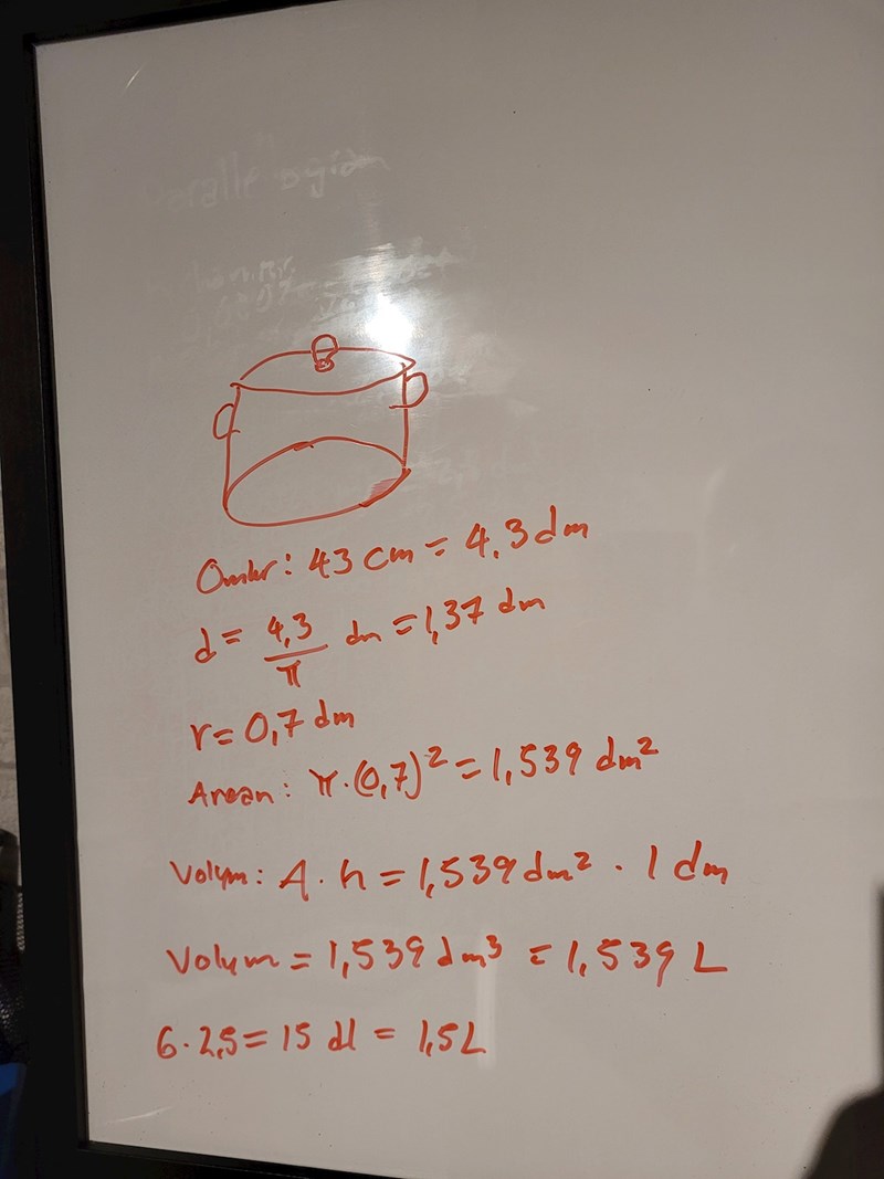 Du tänker göra soppa till 6 personer. En portion beräknas till 2,5 dl. Räcker det med en kastrull med höjden 10 cm och omkretsen 43 cm?