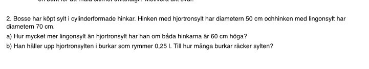 Smutstvätt skrev:Inaa skrev:Smutstvätt skrev:Hur beräknas volymen av en cylinder? Hur mycket hjortronsylt finns det i hinken? Hur mycket lingonsylt finns det i hinken?