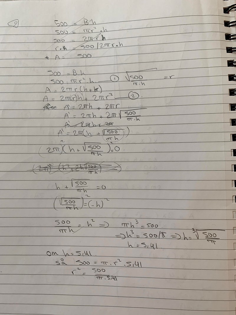 vi vet att cylinder area är 2pr(h+r) = A och volymen är 500= B.h ... men vad gör derivatan med dessa och göra?