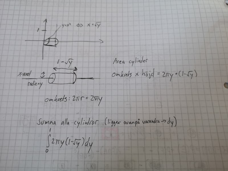 Hur gör jag för att lösa den med cylindrical shells metoden? Ändrar jag gränserna för integralen och till vad isåfall? Har förstått att jag ska multiplicera intregralen med 2pi