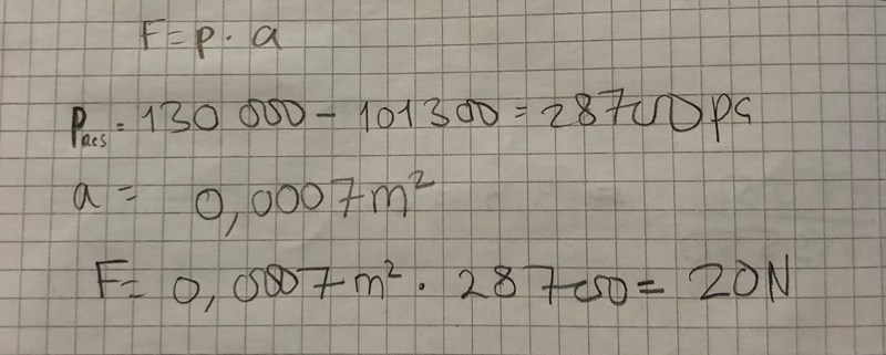En cylindrisk behållare, som är försedd med en tättslutande kolv, innehåller luft. Vid ett visst läge hos kolven är den instängda luftens tryck 1,30 bar. Hur stor kraft fordras för att hålla kvar kolven i detta läge? Barometerståndet är 1,01 bar och kolvens tvärsnittsarea är 7,0 cm². Friktionen kan försummas.
