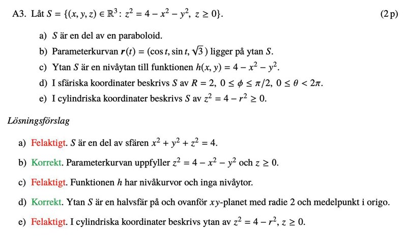 På fråga c) undrar jag varför 4-r^2>=0 inte stämmer också. Om z>=0 ska väl z^2>=0 också? Om z=4-r^2 borde väl även det vara >=0? Låter som en rimlig förklaring tycker jag, ser däremot att det enda villkoret som anges är z^2>=0 och man kanske inte kan förändra det? Men fattar inte varför helt? Är det pga '','' ? Förstår inte helt och skulle bli superglad om någon ville förklara:)