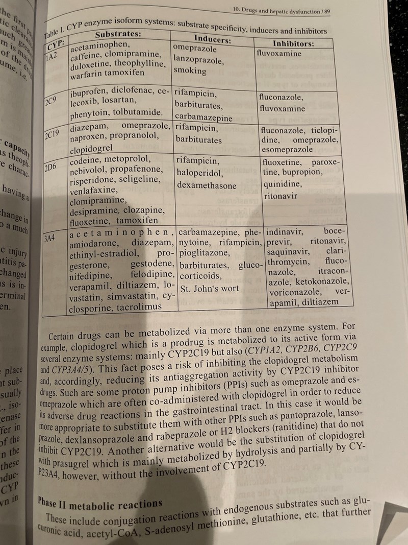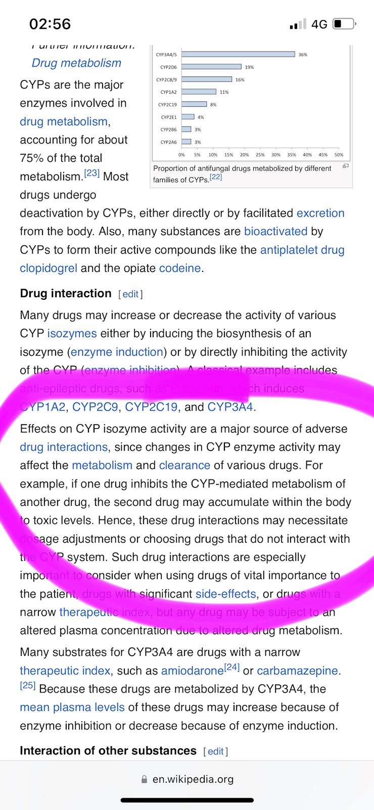 Cyp enzymer kan påverkas av substrat/läkemedel vilka kan delas i så kallad på engelska ”inhibitors” eller ”inducers”. Substrat/läkemedel påverkar Cyp enzymens aktivitet och på det visset påverkas substratets/läkemedlets metabolism- vilket är helt korrekt beskrivning i Wikipedia.