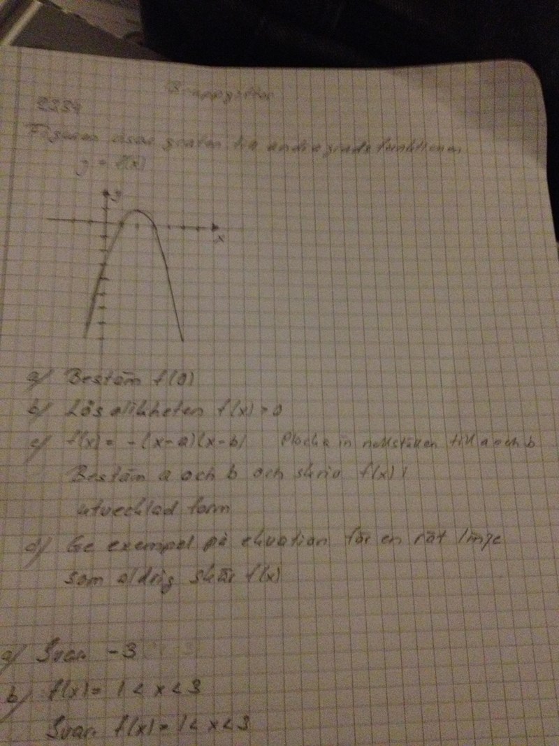 D uppgiften vill jag ha hjälp med. Det står i facit om g(x) = f(x) att ekvationen saknar reella lösningar.