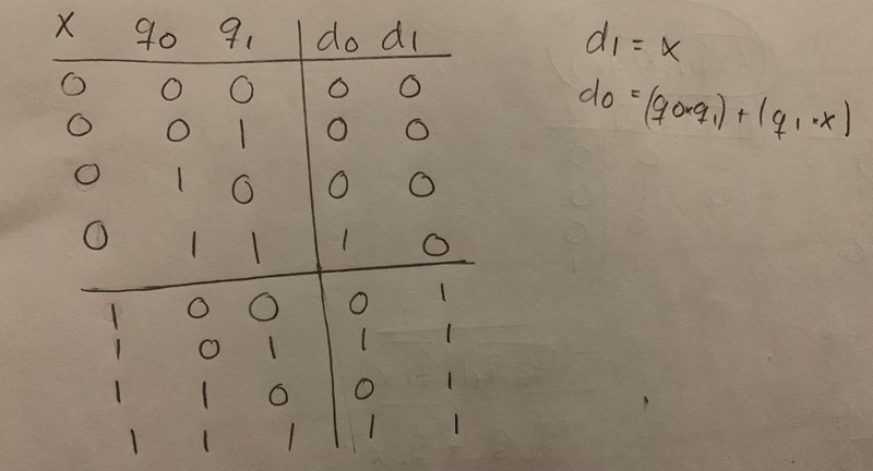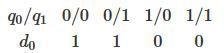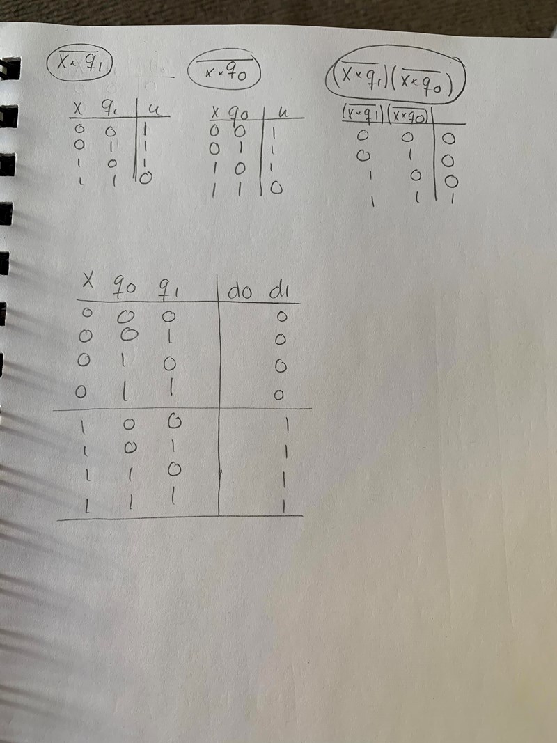 Till att börja med ska jag alltså göra tre små tabeller för nand-grindarna till vänster. Lite osäker på vad jag ska ha för användning av dessa tabeller när jag ändå får ut q0*q1+q1*x=d0.