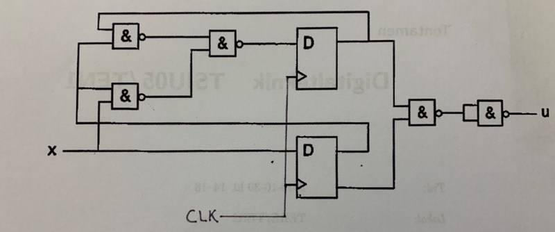 Nu när man har d0 och d1, ska jag alltså kunna göra tillståndsdiagram, men hur blir det då med de sista nand-grindarna som är kopplad till utsignalen?