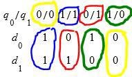 Sedan tycks du ha x/q0/q1 (tre binärer med 8 värden) som input till d0/d1