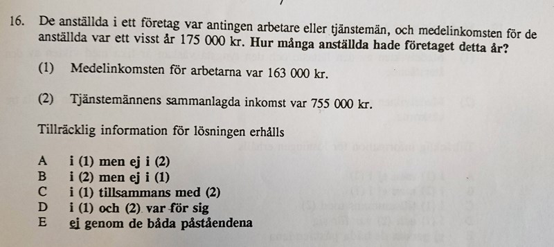 !Smaragdalena skrev :Eftersom det är en HP-fråga och man har ont om tid när man skriver HP, skule jag nog bara konstatera att "det ser ut att vara tillräckligt mycket information om man har båda 1 och 2, men inte med bara den ena" och kryssa i C.