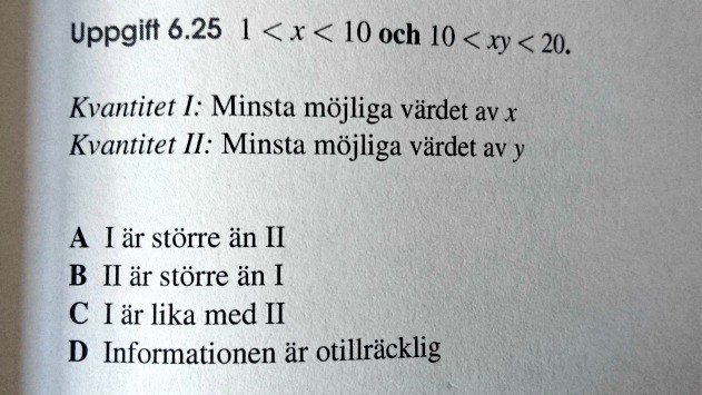 woozah skrev :smaragdalena skrev :Otydligt skriven uppgift! Det står inte att det är nödvändigt att x och y har sina minsta värden samtidigt, men så måste det var för att ge svaret från facit..