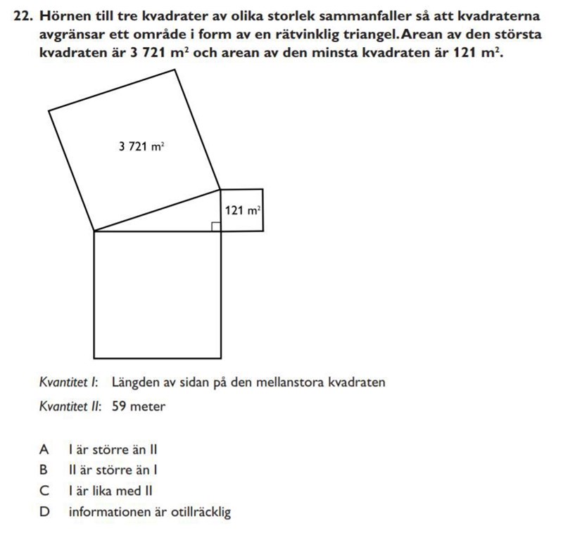 För den här uppgift har jag tänkt att Pythagore satsen gäller om . är samma som 50* (59+9) + , dvs 3400+ 81. Och 3481+121=3602 som är mindre än 3721! Hur tänker man? Jag fick fel. Hur tänker man så att det bli rätt?