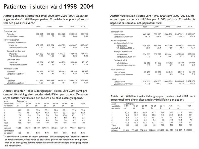 Antal patienter i vård är antalet unika patienter som givits vård, oavsett hur många gånger patienten givits vård. Om jag som person tar emot vård tre gånger under 2004 så innebär det alltså ett tillskott på en patient i vård det året.