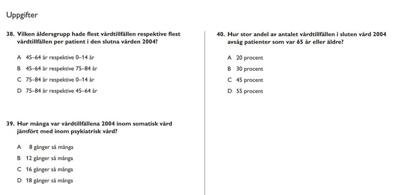 Jag har tre frågor, nämligen 38, 39 och 40, från HT 2014 kvantitativ del 2 som jag kan inte besvara för att jag förstår inte skillnaden mellan olika kategorier i grafen (vård och vård per patient)!