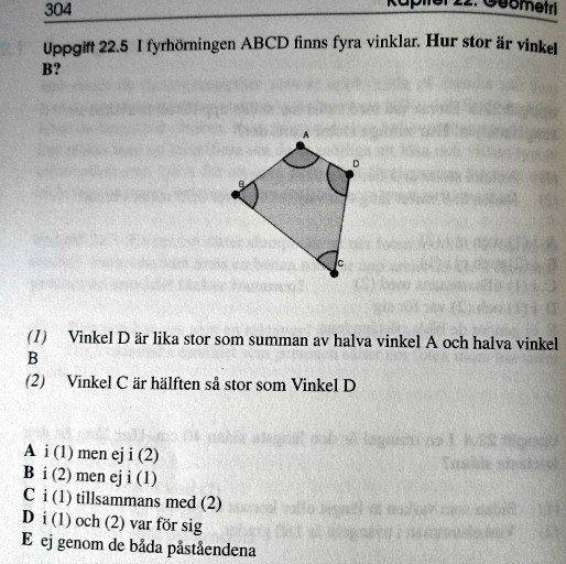 Du vet att fyrhörningens vinkelsumma är grader. Från information (1) får du veta att . Från information (2) får du veta att . Med informationen från (1) och (2) kan du beräkna vinkeln .