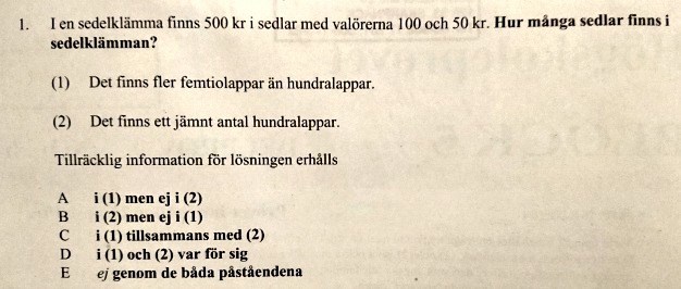 Där svarade jag C. Från B vet vi att et finns antigen 2 eller 4 hudralappar, och från A vet vi att det kan bara vara 2 hundring och 6 50:io.