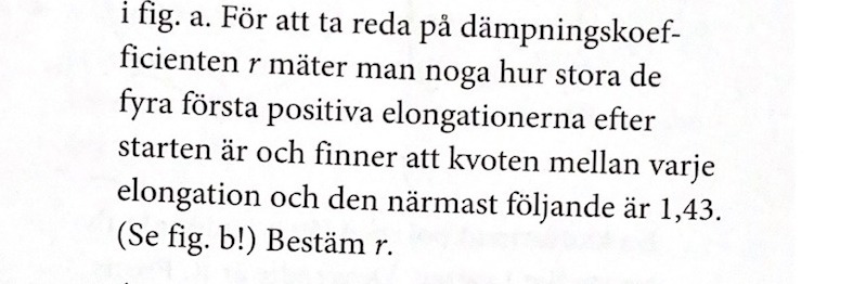 JohanF skrev:Jag tror kanske att en godtagbar lösning av uppgiften beror på i vilken kurs den ges. Ges den i kursen fysik 3 på gymnasiet där man behandlar dämpad harmonisk rörelse mer översiktligt så kanske man tillåts få lite hjälp genom att läsa av grafen ändå. Jag tycker grafen ser väldigt tillrättalagd ut för att man ska kunna räkna ut ett bra närmevärde på periodtiden genom att läsa av tiden för fyra svängningsperioder. Det kan inte gärna vara ett misstag att man har zoomat in på det där sättet. Annars går den ju att lösa även enbart med texten.
