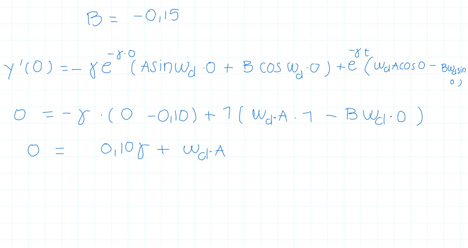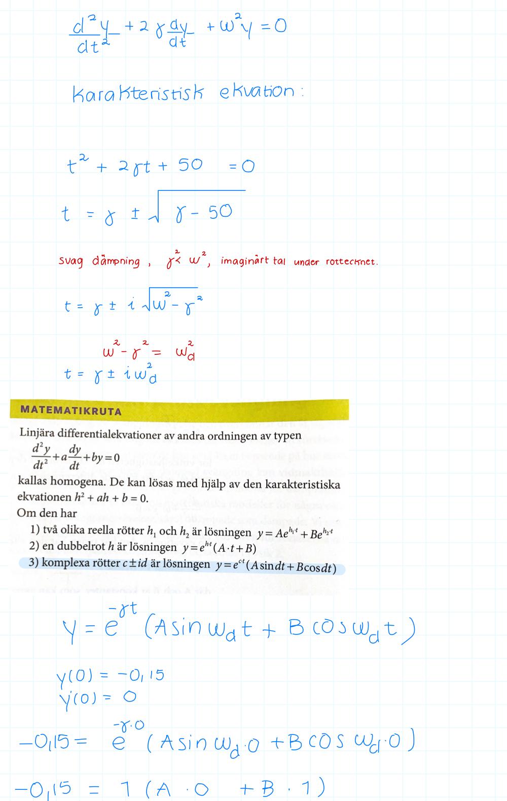 Snarare än att försöka hitta ett analytiskt uttryck för svängningsrörelsen som funktion av t (du borde sätta y(0)= 0.15 där, men det hjälper dig inte så mycket eftersom det blir ändå ganska komplicerat), så ska du förmodligen som Pieter säger koncentrera dig på den dämpade delen av rörelsen.