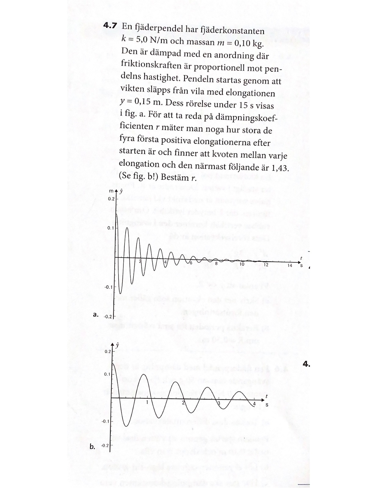 Jag tror kanske att en godtagbar lösning av uppgiften beror på i vilken kurs den ges. Ges den i kursen fysik 3 på gymnasiet där man behandlar dämpad harmonisk rörelse mer översiktligt så kanske man tillåts få lite hjälp genom att läsa av grafen ändå. Jag tycker grafen ser väldigt tillrättalagd ut för att man ska kunna räkna ut ett bra närmevärde på periodtiden genom att läsa av tiden för fyra svängningsperioder. Det kan inte gärna vara ett misstag att man har zoomat in på det där sättet. Annars går den ju att lösa även enbart med texten.