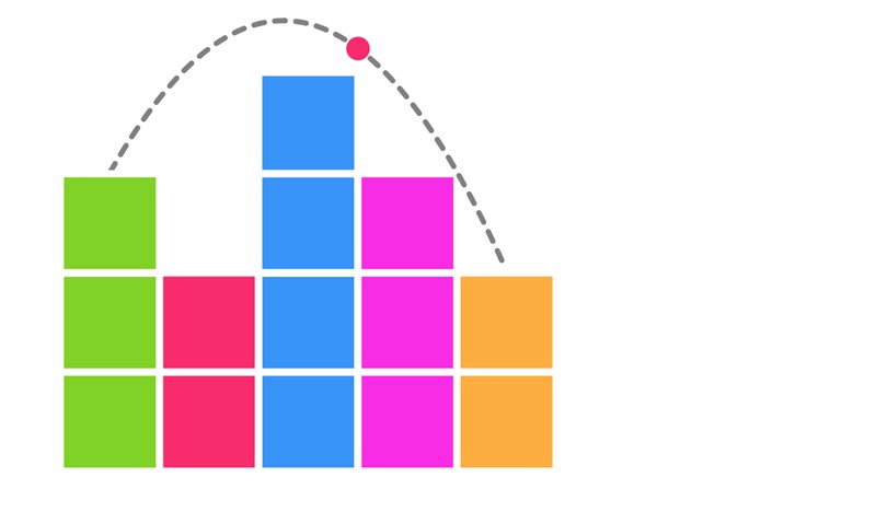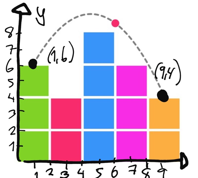 I datorspelet Block mock sparkar spelkaraktären Joe en boll från mitten av den gröna stapeln till mitten av den orange. Bollens bana kan beskrivas av andragradsfunktionen y=ax^2+bx+4, där y är höjden över marken och x är det horisontella avståndet i le. från den gröna stapelns vänstra kant. a och b är konstanter. Bollen landar 8 le. från utsparksplatsen.