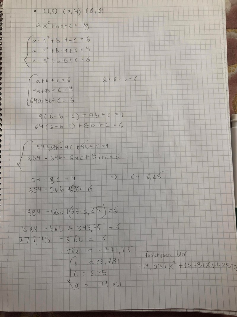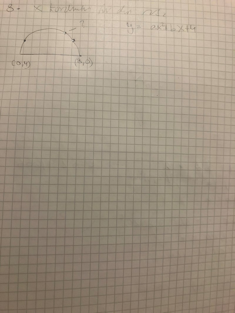Jag valde 3 st punkter från koordinatsystemet som Yngve ritade. Sen så satte jag x och y värden och skrev ett ekvationssystem. Är ekvationen rätt? För isåfall så kan jag räkna ut maximipunkten
