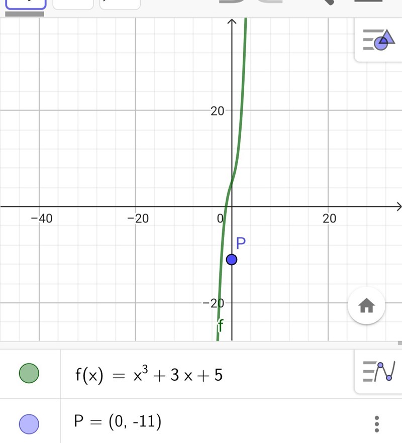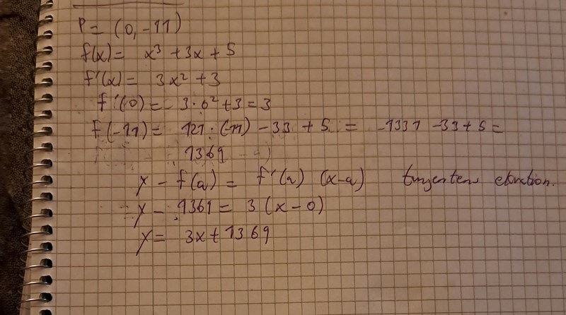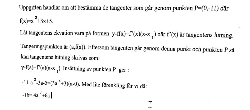 "Bestäm de tangenter till y=f(x) (om det finns några) som går genom punkten P=(0,-11), där f(x)=x^3+3x+5. "
