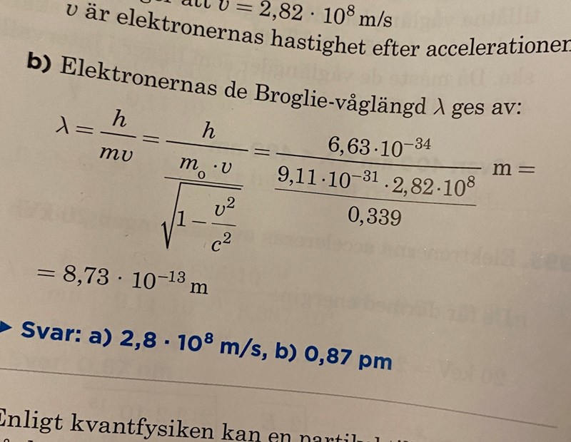 Jag räknade enbart med elektronens massa, 9.11*10^-31 kg, och hastigheten som man räknade ut i uppg A. Men det var fel. Varför delar man med 0,339?