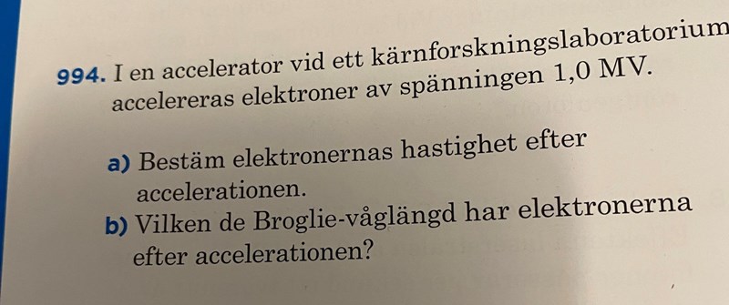 Elektronens kinetiska energi är nästan dubbelt så stor som elektronens viloenergi på 511 keV. Det står nog i kapitlet innan hur man ska räkna men det finns ett enklare sätt att bestämma -faktor än vad facit gör.