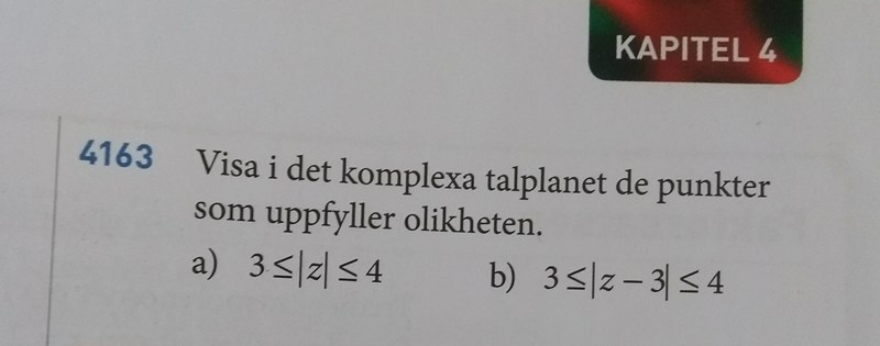 le chat skrev:Jaha, så om jag skuggar cirkeln i mitten så uppfyller den endast |z| = 3 och jag kan inte skugga hela cirkeln inklusivt |z| = 3 och |z| = 4 eftersom jag har två cirklar. Suddar jag ut cirkeln i mitten och därefter skuggar så uppfyller den endast |z| = 4.