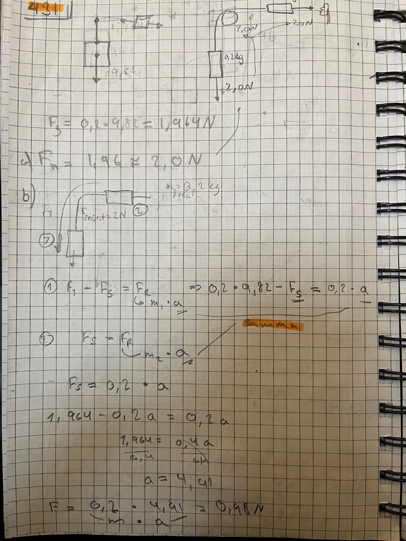 Uträkningen stämmer men undrar bara om man kan förklara det med ord istället. Jag förstår även inte varför Fs (snöret) = Fr (resultanten)? Är det för att i uppgiften skriver dem att räkna resultanter av snöret?
