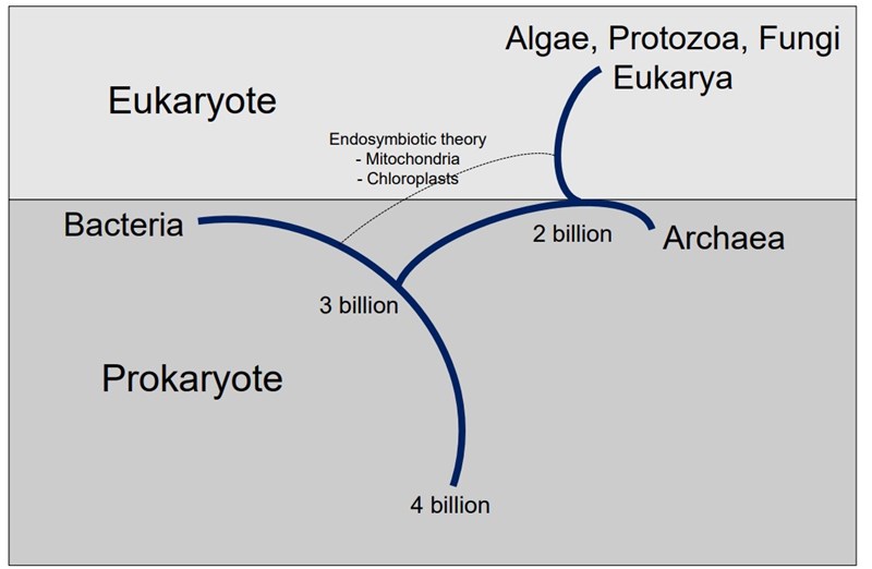 Jag känner mig jättedum men jag förstår verkligen inte den här bilden... Så för 3 miljarder år sedan  samexisterade bakterier och arkeer, och en miljard senare skedde endosymbioses om ledde till att eukaryotter bildades?