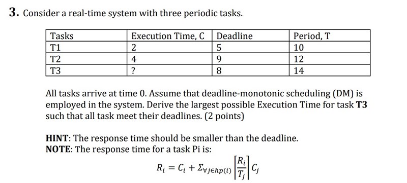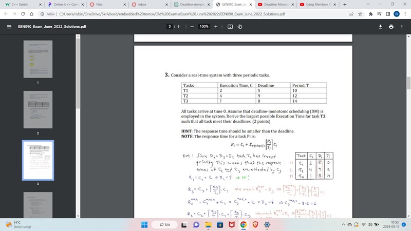 Detta ger att exekveringstidenn för T3 kan som värst vara 3 sekunder om T2 och T3 ska hinna med sin deadline.