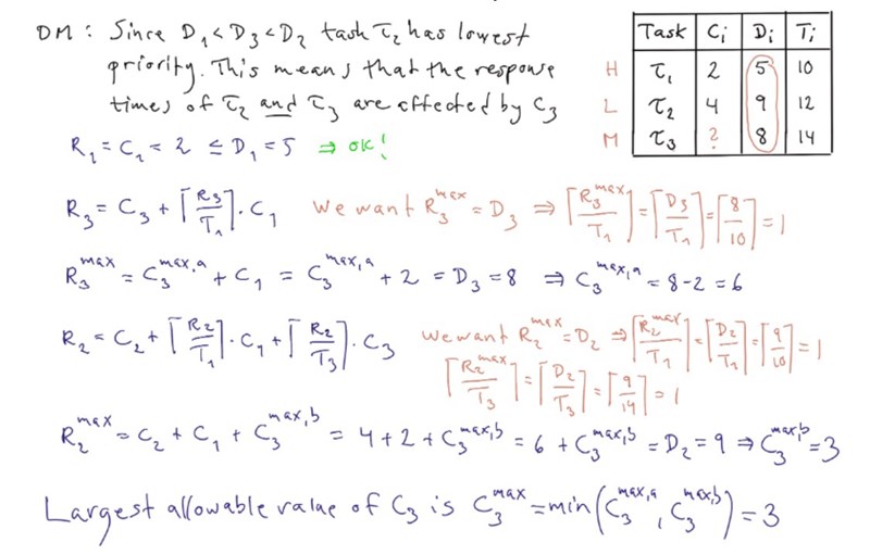 Det har nu gått 2+x+4 tidsenheter. T1 når alltid sin deadline. Notera nu att eftersom D2 > D3 måste vi välja execution time för T3 så att det är inom deadlinen för T2. Annars kommer inte T2 att nå sin deadline.