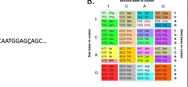Bilden visar en gensekvens som innehåller startkodonet för ett protein (A), samt den genetiska koden (B).
