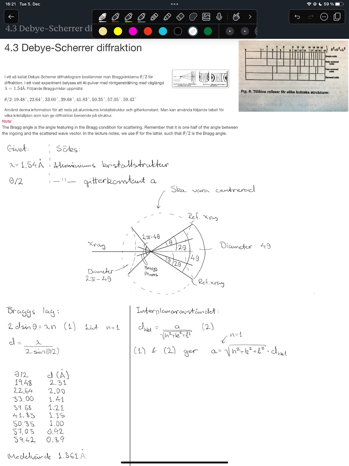 Hej, ett Al-pulver belyses med röntgenstrålning med våglängd , vi har ett antal vinklar . Jag har beräknat d med Braggs lag för de olika vinklarna.