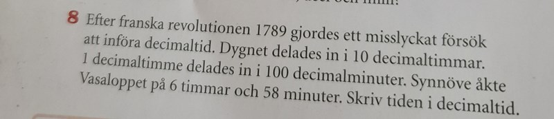 Känns ditt svar då rimligt att sex vanliga timmar och 58 vanliga minuter skulle vara 4 decimaltimmar och 18 decimalminuter?