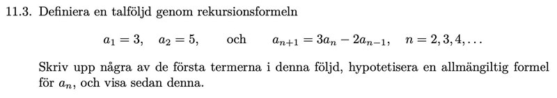Induktionsantagande: Antag att formeln gäller för något n och n-1. Visa att det gäller för något n+1 också.