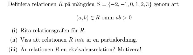 Ryszard skrev:Korrekt, relationer som kan skrivas , där och kommer från mängden S . i ditt exempel så stämmer det att förbindelsen inte är någon relation på S eftersom produkten inte är större än