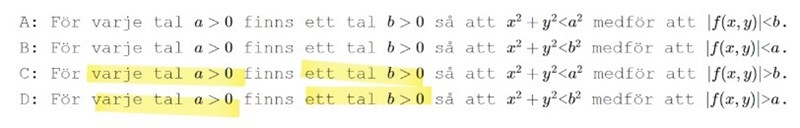Okej, nu ser jag! Så när jag kollar på D tänker jag att för varje glob i definitionsmängden () finns ett b^2. När vi gör globen mindre kommer funktionen att vara större än a. Det betyder att när vi gör globen mindre finns det ett funktionevärdet som är större än a?