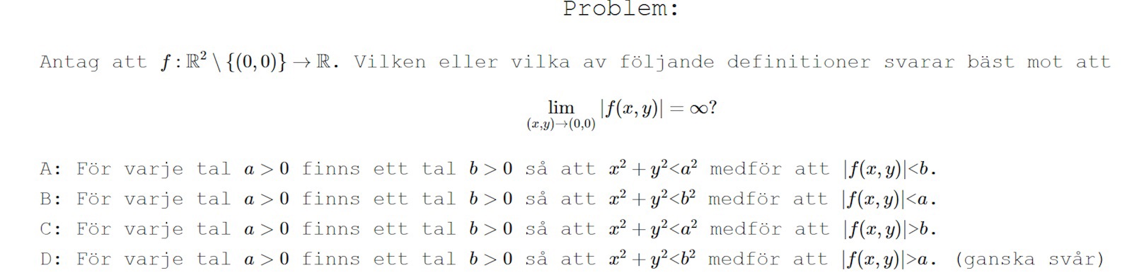 Hej, stort tack för svar! Känner att jag devlis hänger med i resonemanget men ändå inte förstår. Tror inte jag förstod definitionen av gränsvärde fullt ut. Antar att det vi kallar för a och b i denna uppgift är det vi vanligtvis kallar för delta och epsilon. Känner att jag inte riktigt har förstått definitionen av gränsvärde fullt i ens en variabel tror det är där min kunskap brister. Ska läsa på mer teroi och göra några eklare uppgifter och sen föröka förstå uppgiften igen.